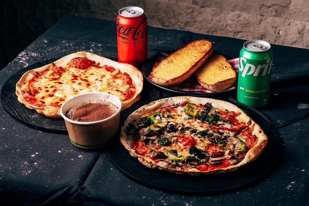 Duetto Deal$492 x Medium Pizzas, Garlic Bread, Tiramisu, 2 x Can Soft Drink “Perfect for two – date night in or catch up with a friend.”