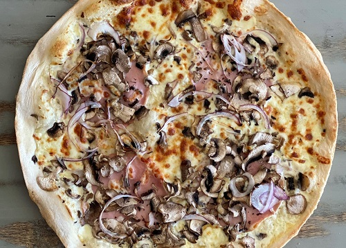 Cream Base, Ham, Onion, Mushroom, Parmesan, Oregano, MozzarellaChoose one