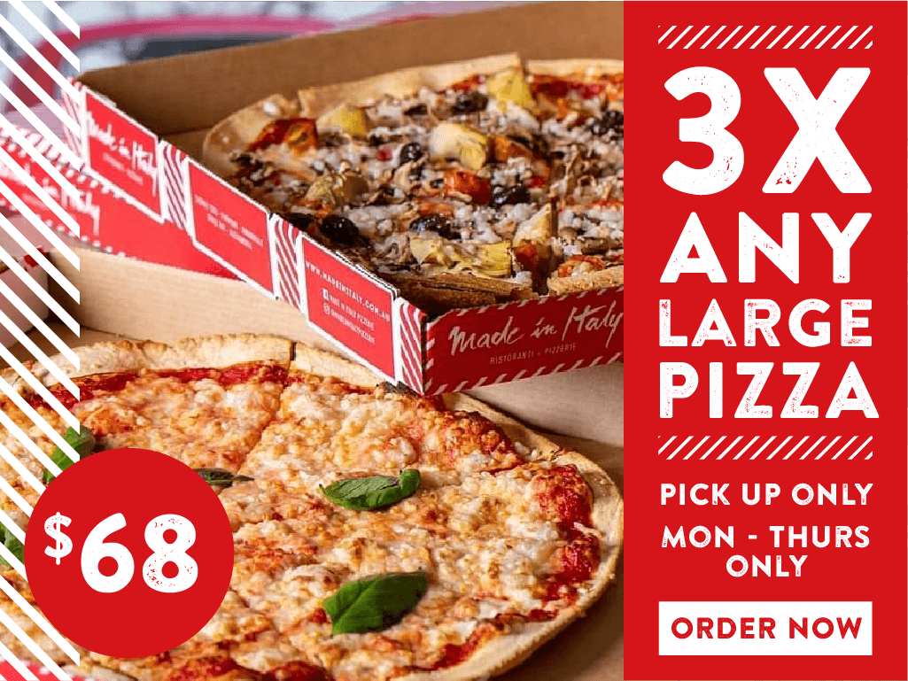 3x any 15" inch XLarge Pizza$75(Pick Up Only) Tues-Thurs OnlyAvailable days: Tuesday, Wednesday, Thursday